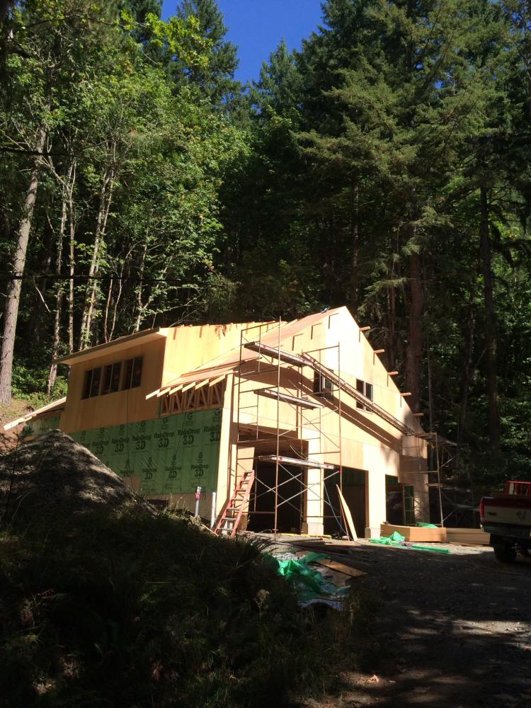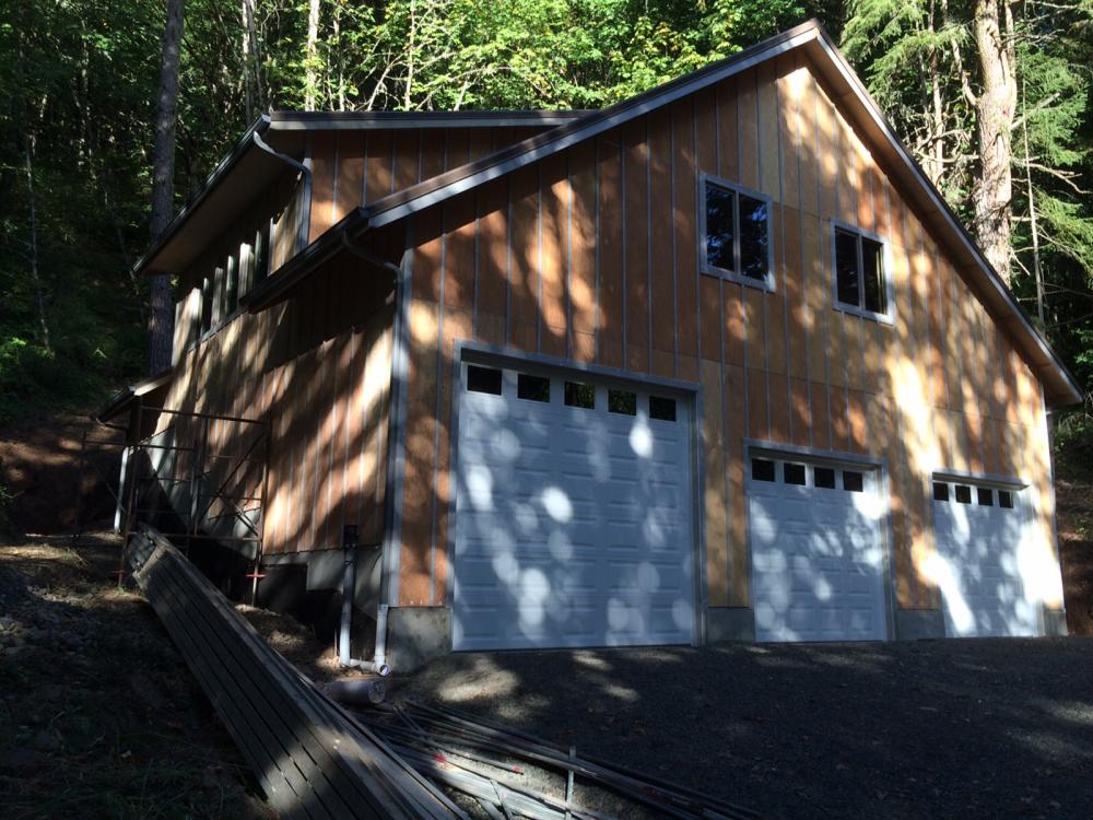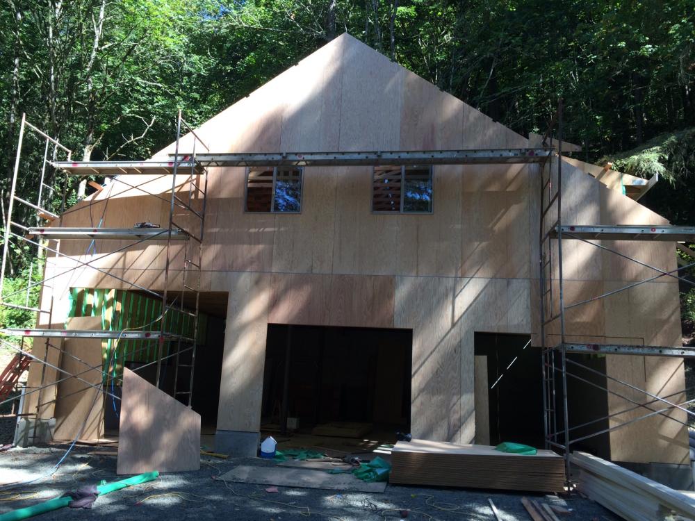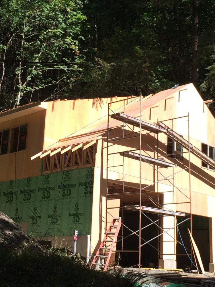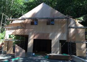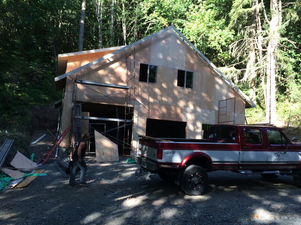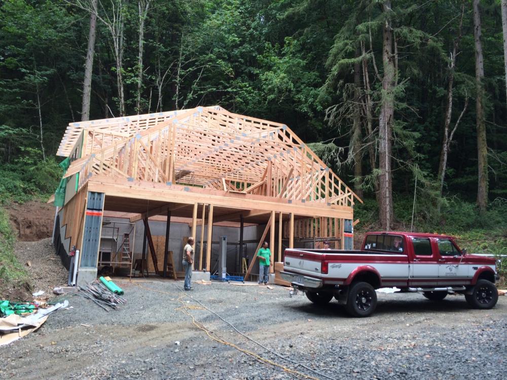Foundation is in Foundation is in Exterior wall framing Roof truss delivery Rolling trusses for roof framing Rolling trusses for roof framing Sheeting Sheeting Window install Garage doors installed Framing and siding complete Framing and siding complete Framing and siding complete Framing and siding complete Framing and siding complete